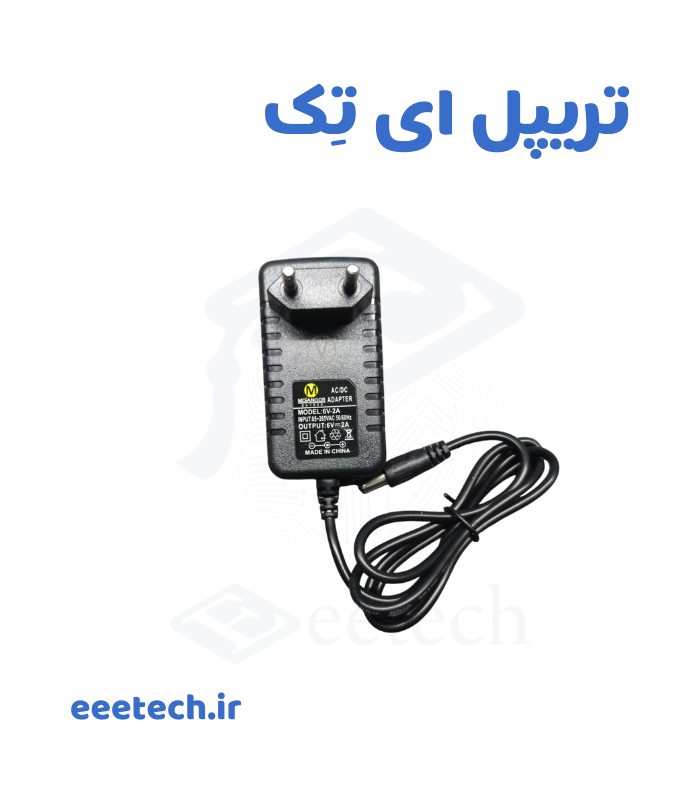 آداپتور دیواری سوئیچینگ با ولتاژ خروجی ۶ ولت DC و جریان ۲ آمپر. ورودی جهانی ۱۰۰–۲۴۰ ولت AC، فیش خروجی DC استاندارد (۵.۵×۲.۱ میلی‌متر).